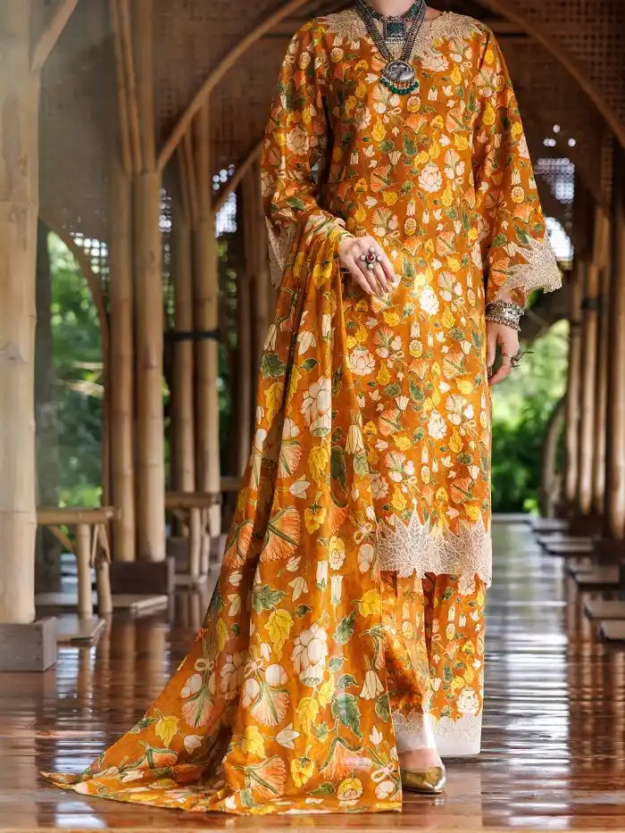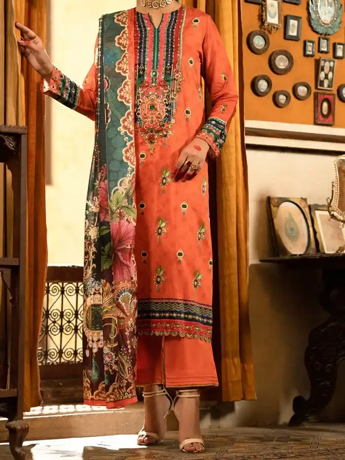 Get a new style with 3 piece orange cotton silk unstitched suit by Almirah brand available for PKR:12,780 PKR:6,390 Only.