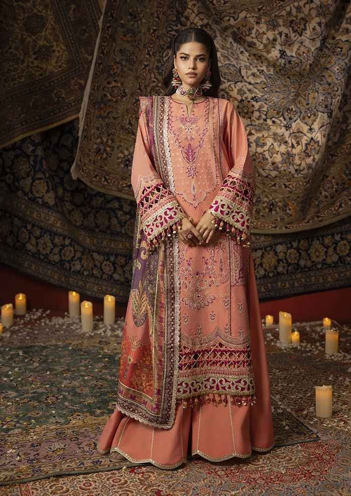 Peach color 3pc embroidered cotton net unstitched suit PKR:7,880 PKR:6,304.