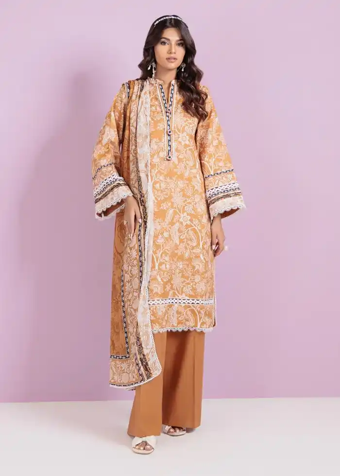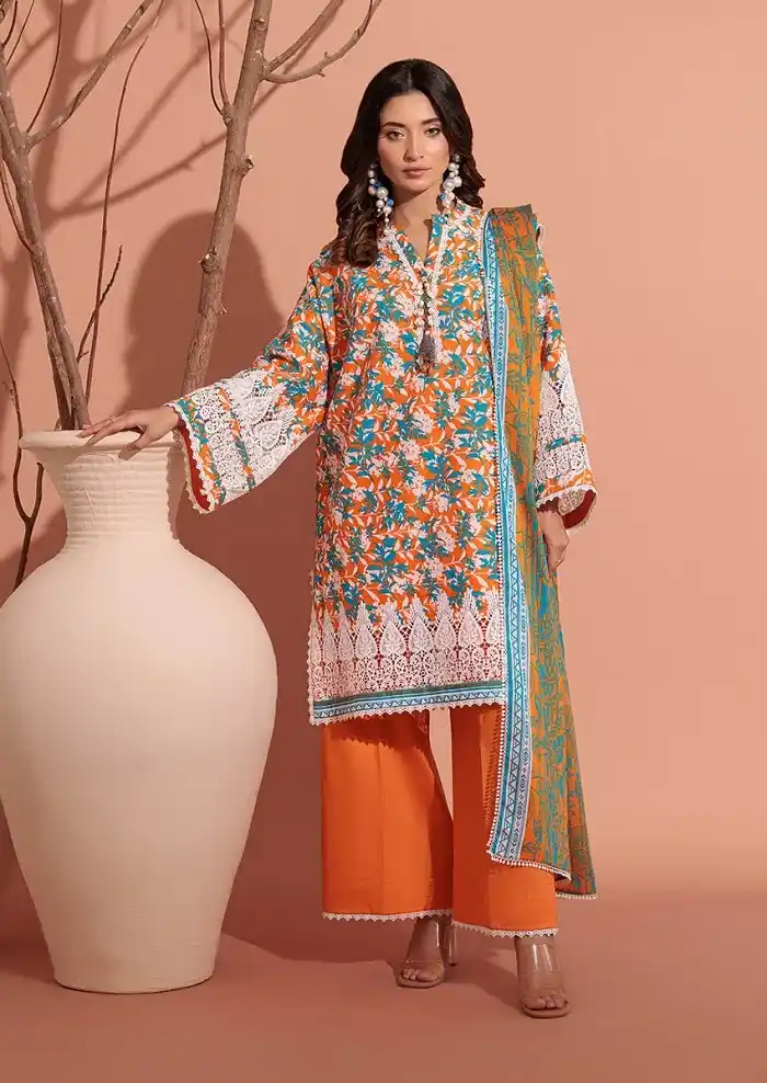 Printed lawn 3-piece unstitched summer orange color suit for women PKR:4,290 Rs:2,574 only.