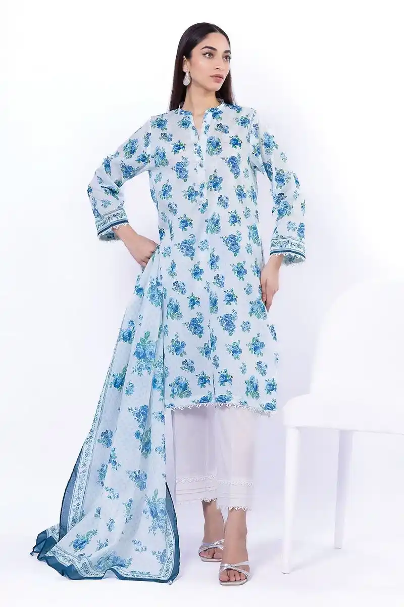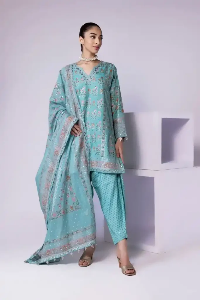 Sky blue color printed summer lawn three-piece suit Rs:4,000 Rs:3,000.