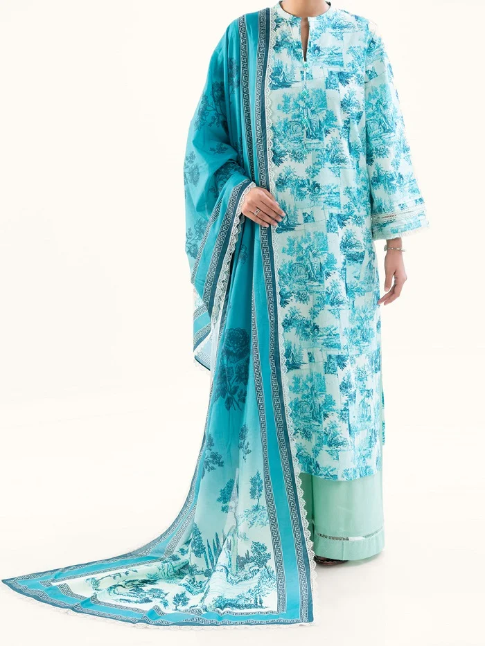 Unstitched 3piece aqua blue lawn suit for women Rs:7,450.