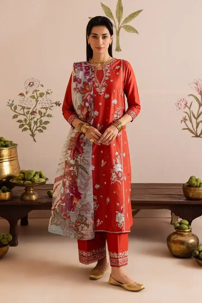 Digitally printed shirt and trousers with digitally printed schiffli jaal dupatta PKR:7,290 only.