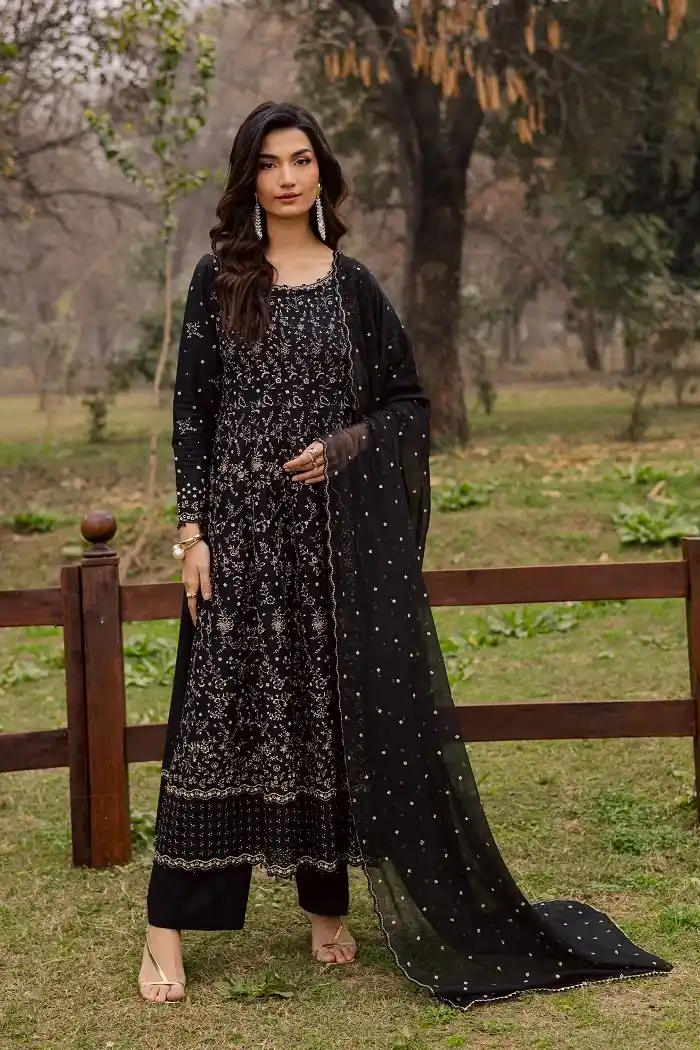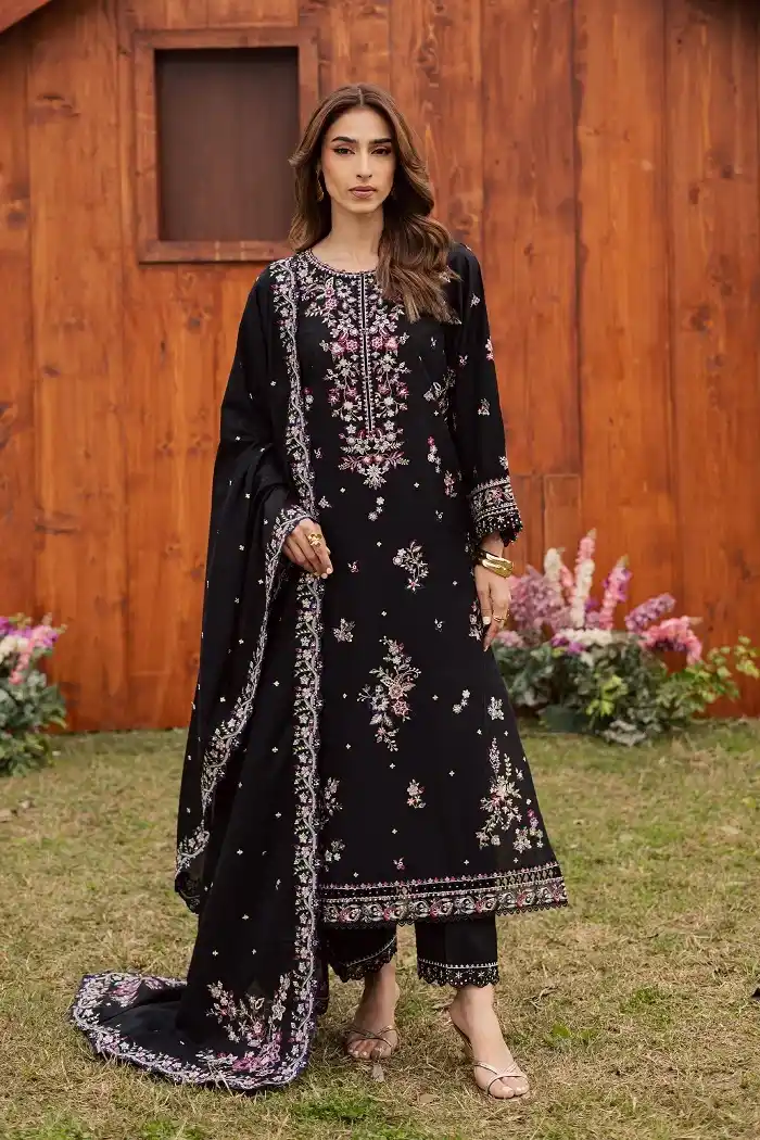 Black 3 pc embroidered lawn suit for ladies wear Rs:19,990.