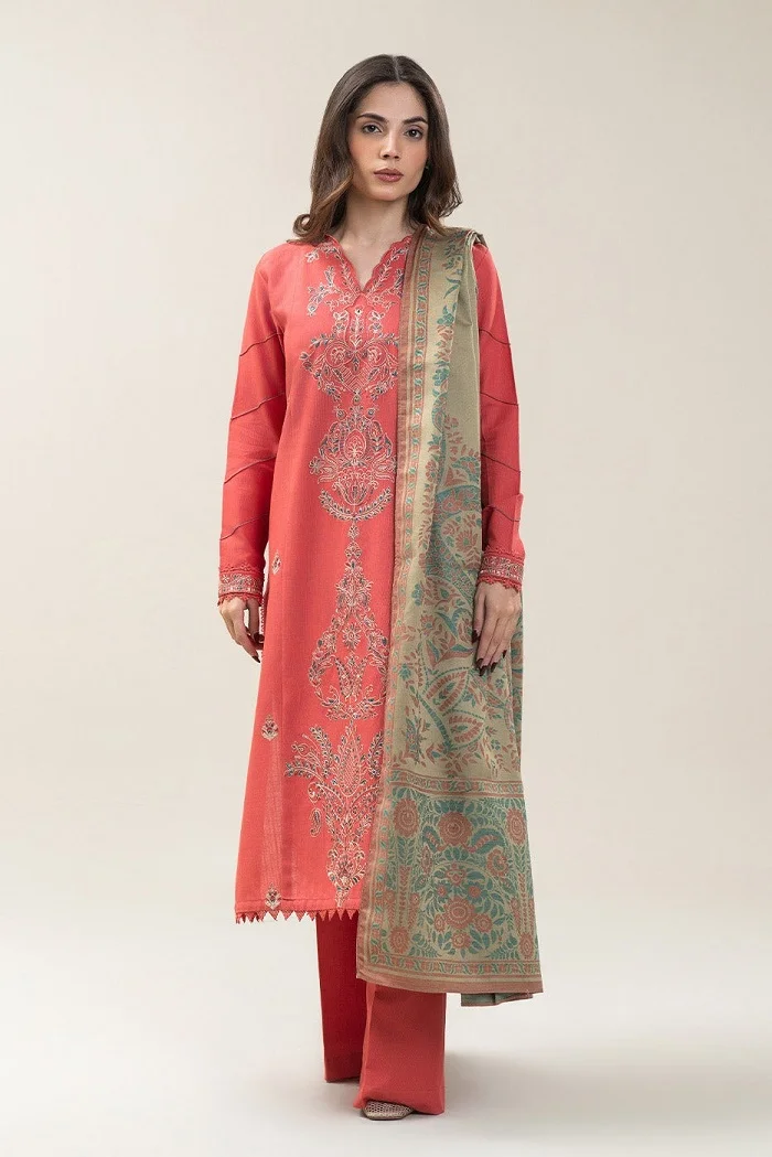 Stylish rust color 3 piece embroidered khaddar suit Rs:7,550.