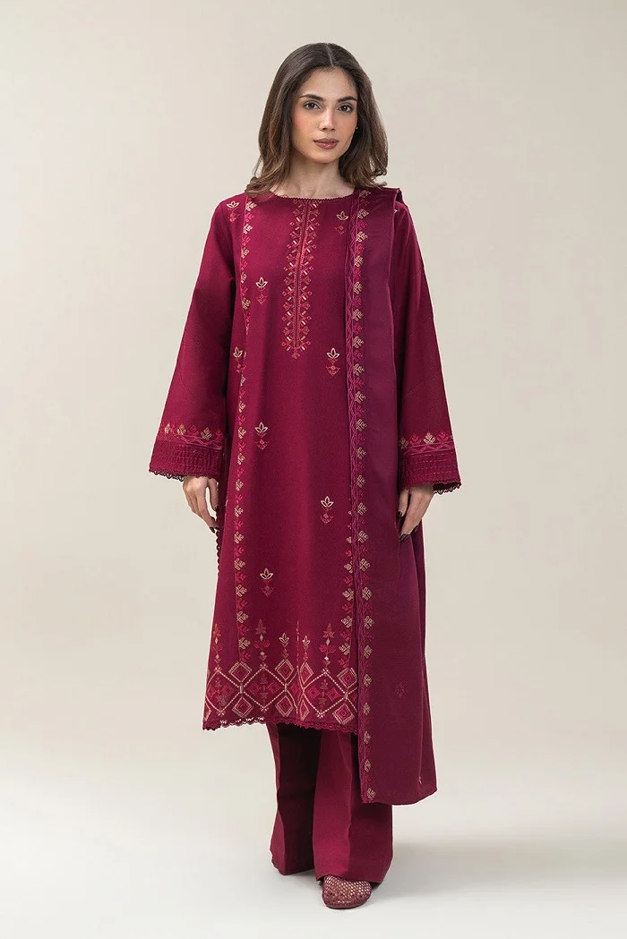 3-piece embroidered khaddar maroon suit Rs:7,450 only.