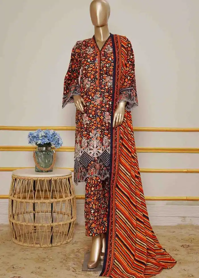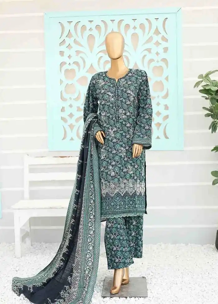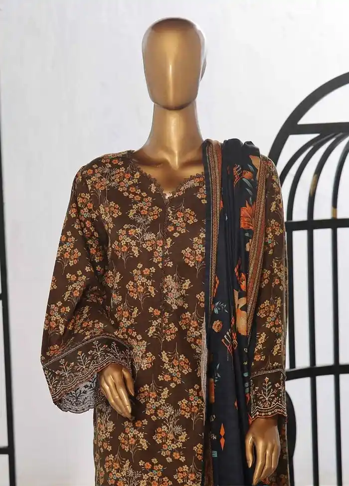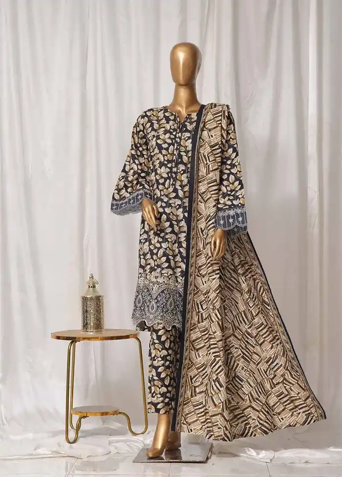 3-piece printed khaddar stitched suit for women PKR:3,399 only.