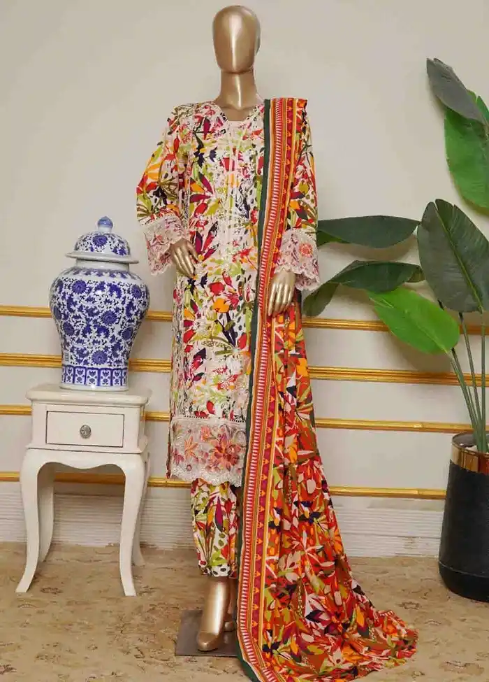 3-piece multi-color digitally printed khaddar embroidered suit Rs:4,595 only.