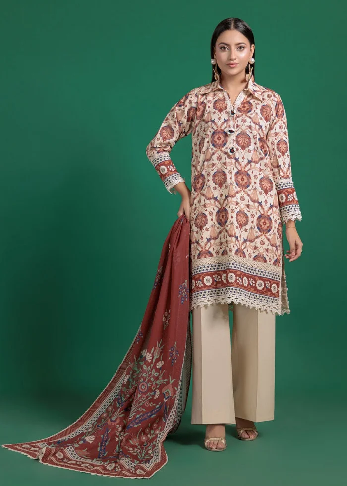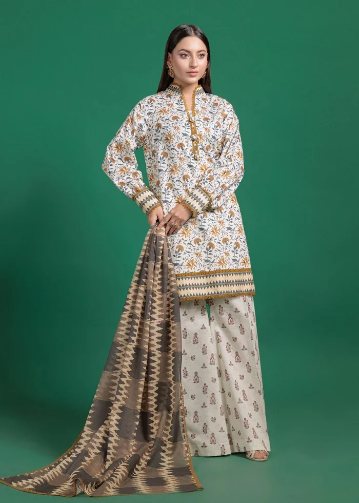 3-pc cream color printed lawn unstitched suit Rs:4,490 Rs:3,592Â save 20% now.