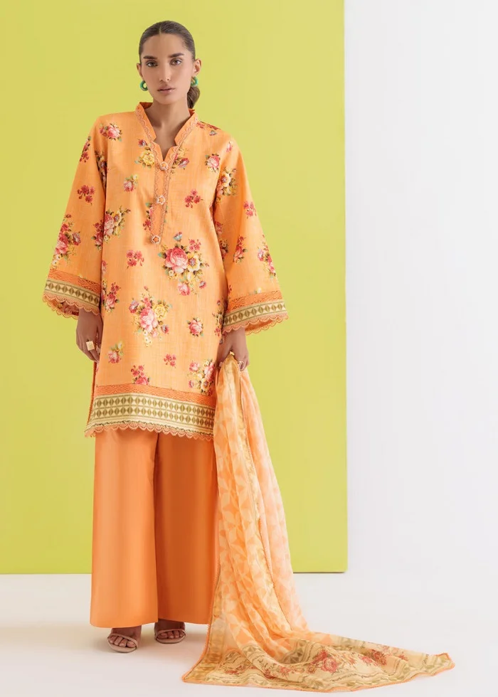 Unstitched 3pc orange color printed lawn suit PKR:8,990 PKR:5,394 only.