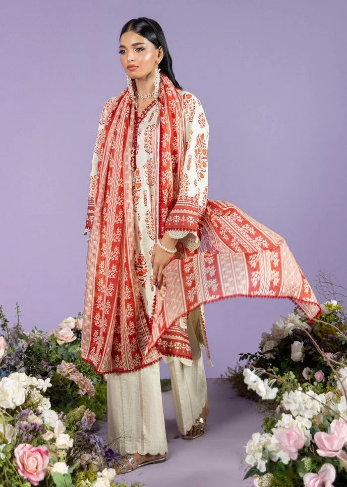 Cream color unstitched printed lawn 3piece suit Rs:4,290 Rs:3,432Â only.