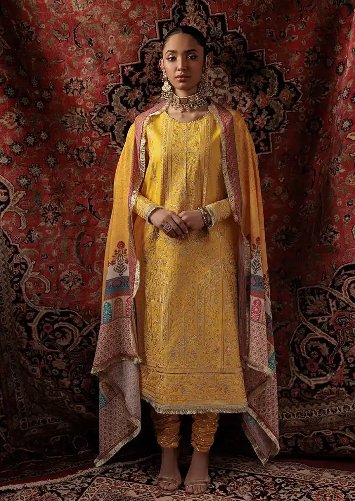 Beautiful yellow color embroidered printed jacquard 3piece suit for festive wear in just Rs.:8,990 Rs:4,495 Only.