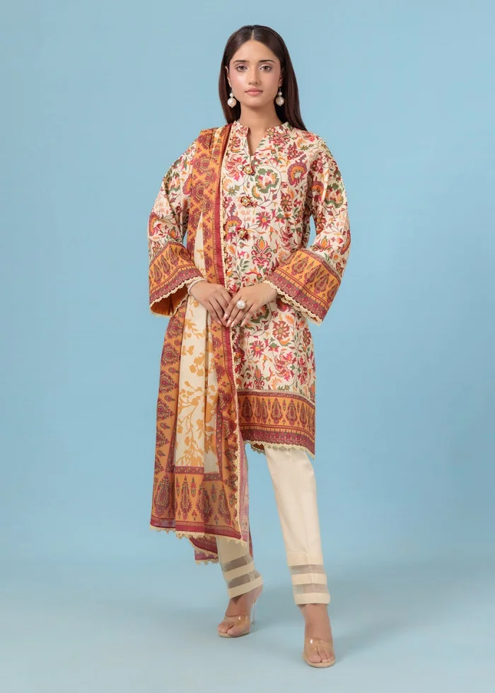 Printed lawn beige color 3 piece unstitched suit Rs:4,380 Rs:3,504 only.