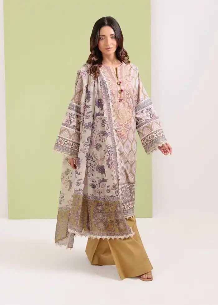 Cream color summer lawn printed 3-piece suit PKR:3,680 only.