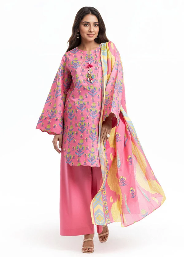 Pink color unstitched 3-piece lawn printed unstitched suit Rs:3,690 only.
