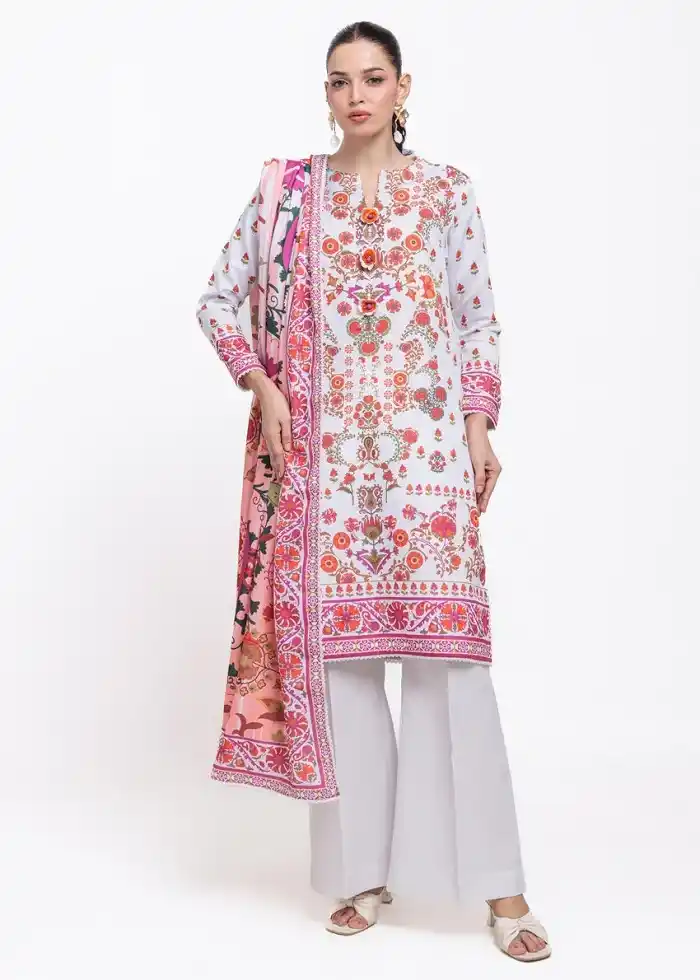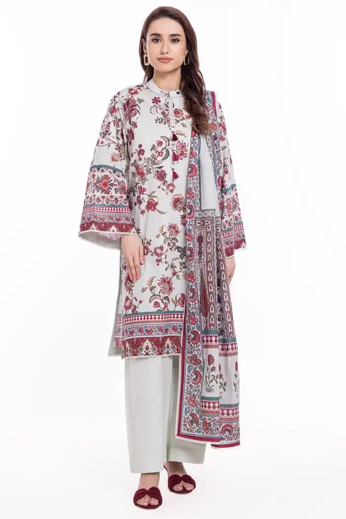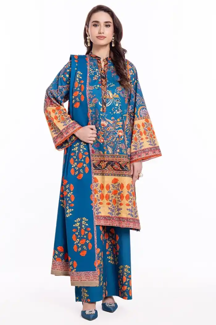 Digital printed embroidered sunrise 3-pc luxury winter suit PKR:7,280 only.