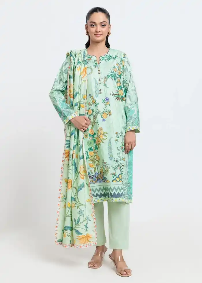 Green digital printed khaddar 3-piece suit PKR:3,580.