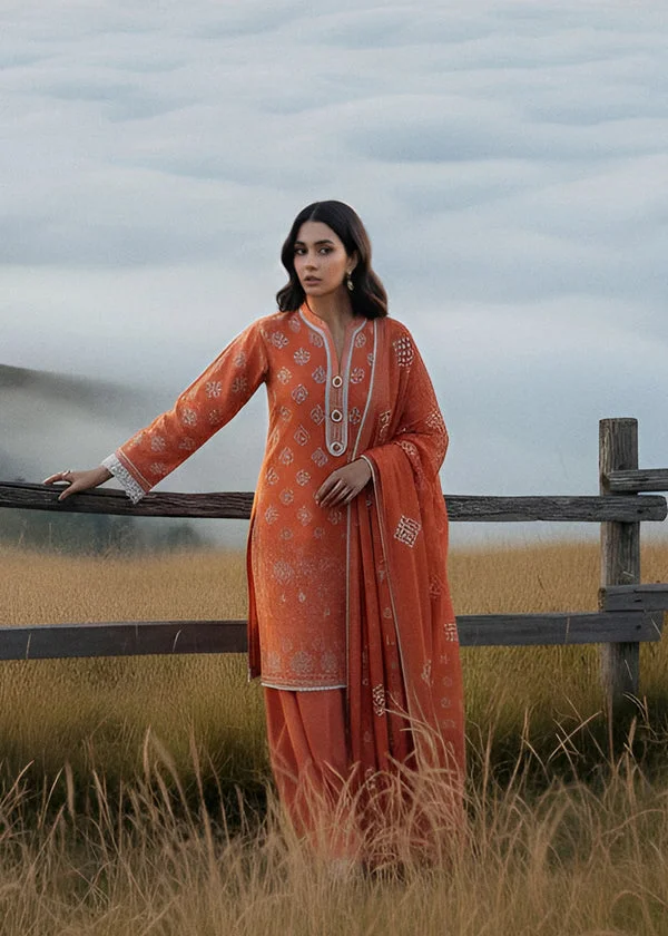 Floral printed winter khaddar 3pc orange color unstitched suit Rs:3,290.