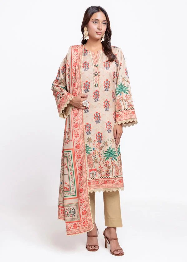 Beige color 3pc digital printed light khaddar unstitched suit Rs:3,290.