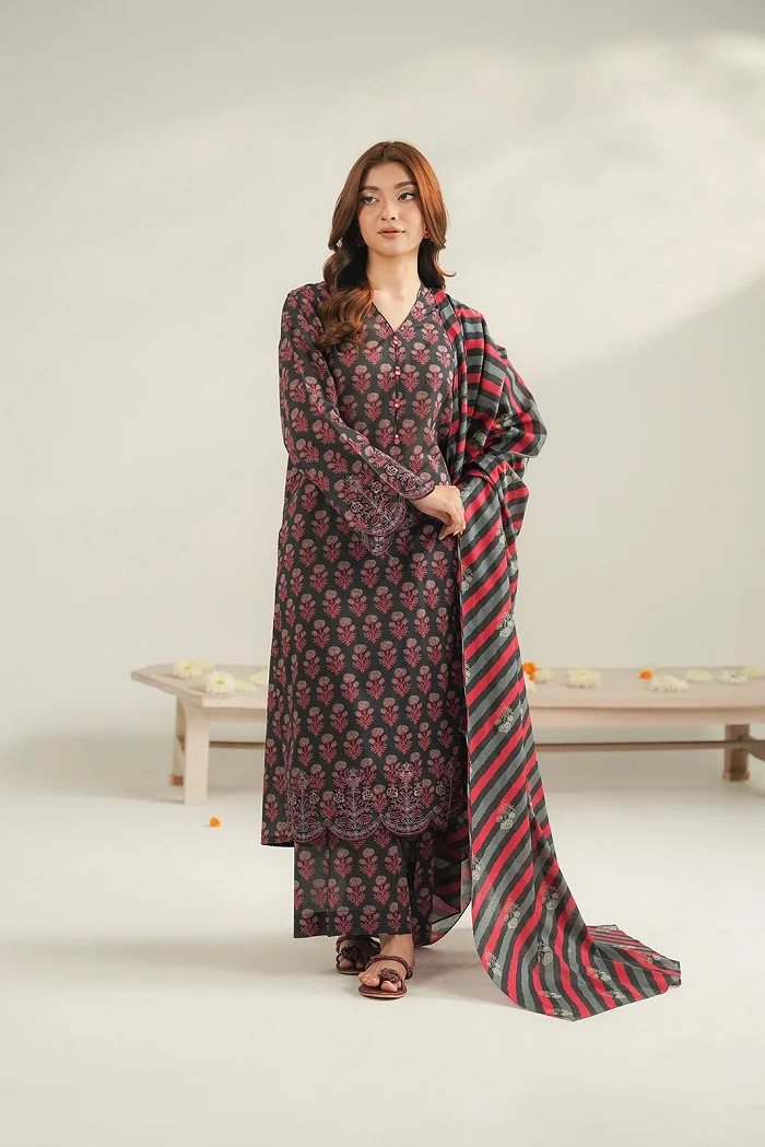 Black color 3-piece printed lawn suit Rs:7,500 Rs:6,000.