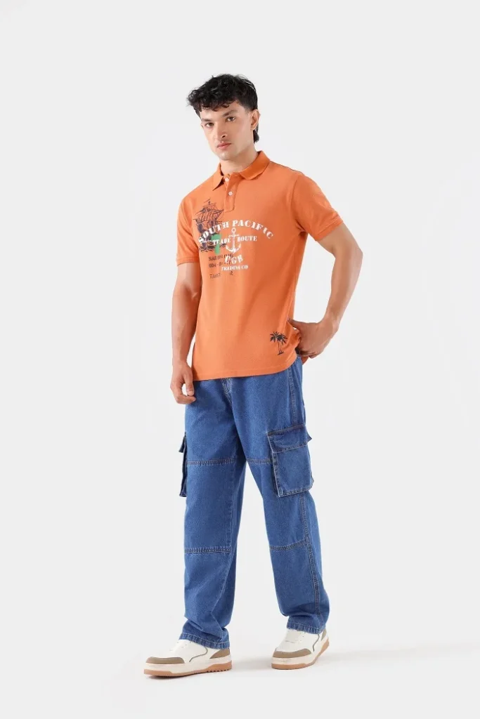 Graphic printed orange color polo shirt Rs:2,999 Rs:1,499.