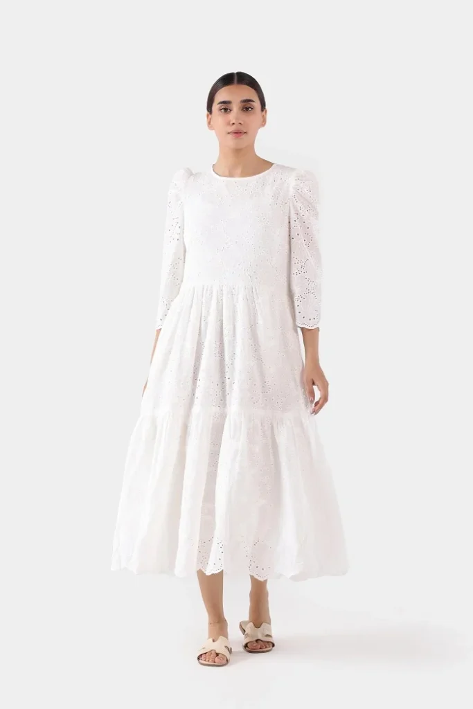 White color summer chikenkari midi dress Rs:5,499 Rs:3,849 only.