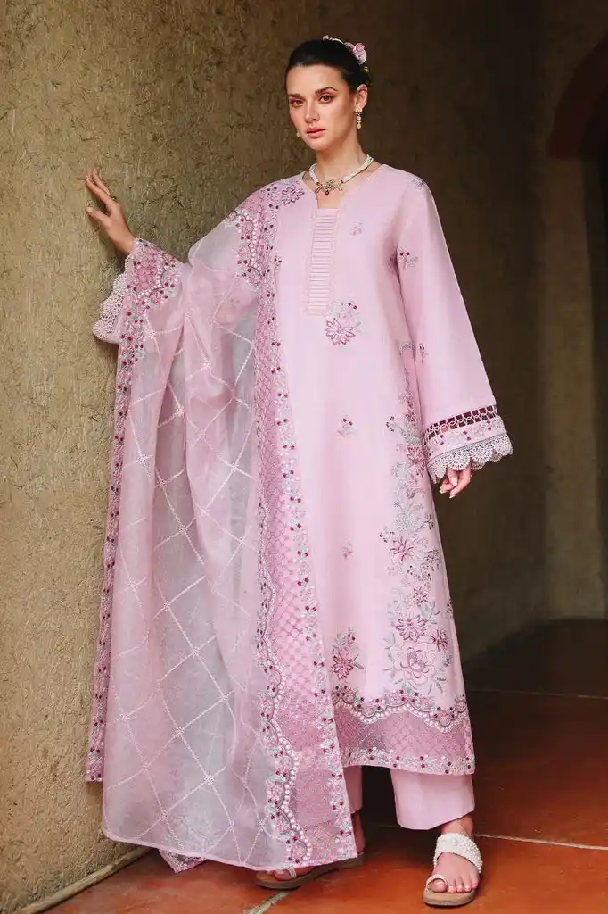 Let’s get a perfect Eid look by wearing this pink color lawn fabric 3pc embroidered suit Rs:8,950.
