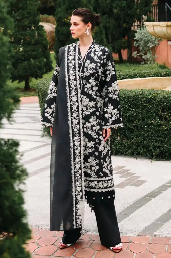 Black Lawn Unstitched Three Piece Embroidered Suit Rs:10,950/- only.