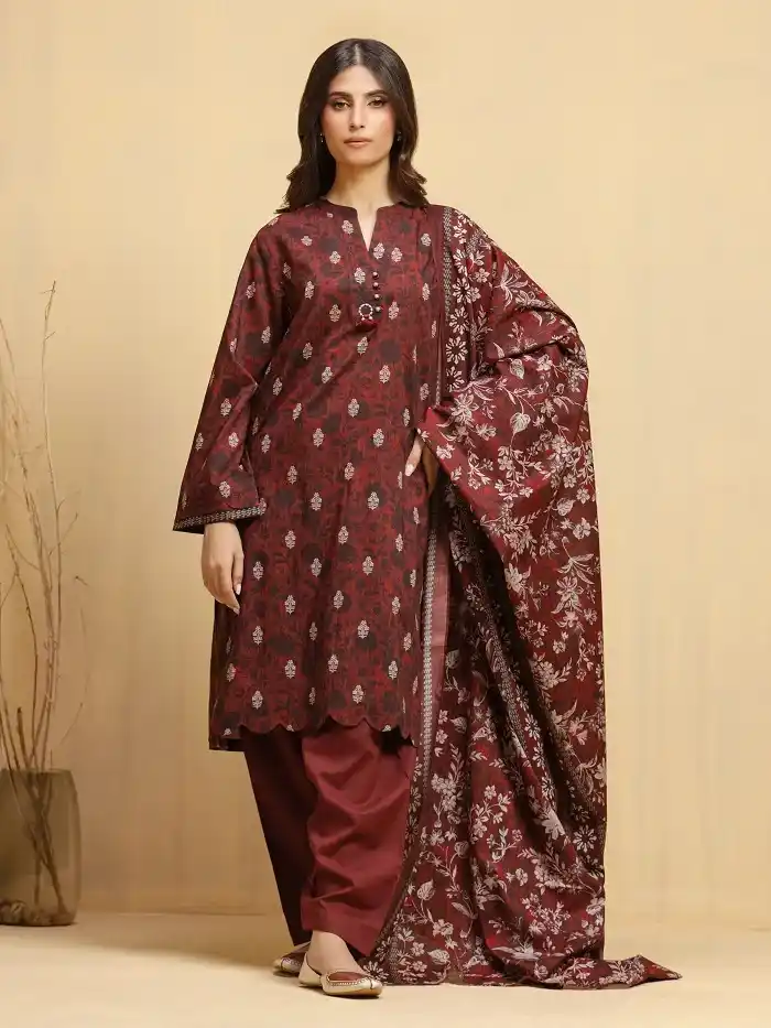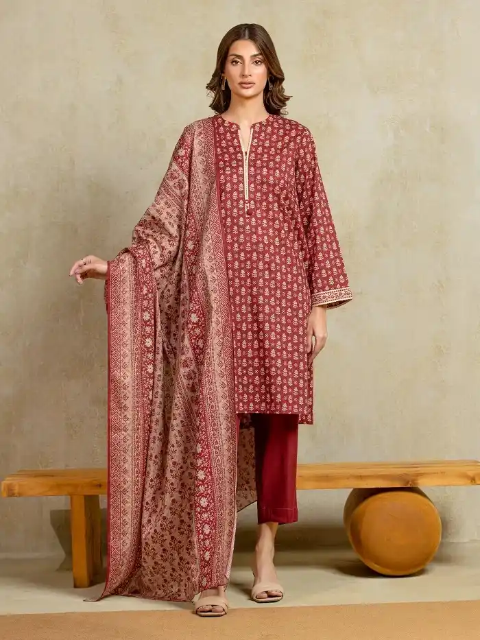 Maroon khaddar 3 piece winter suit Rs:3,300 Rs:2,500.