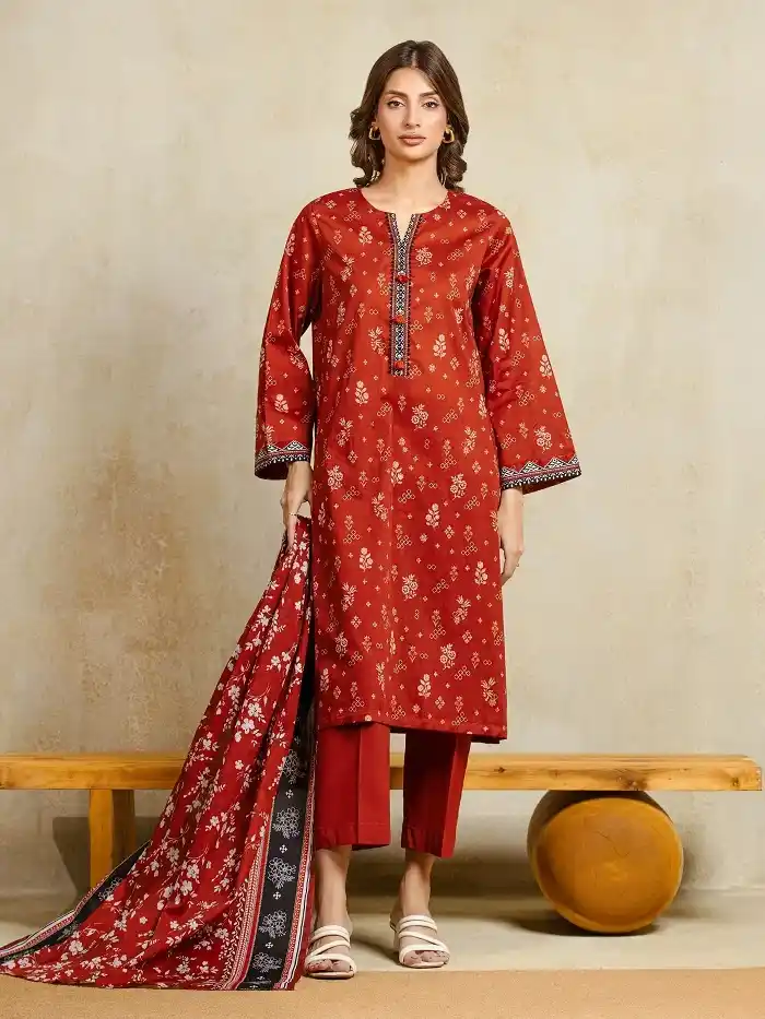 Rust unstitched printed 3 piece khaddar suit for women Rs:3,300 Rs:2,500.