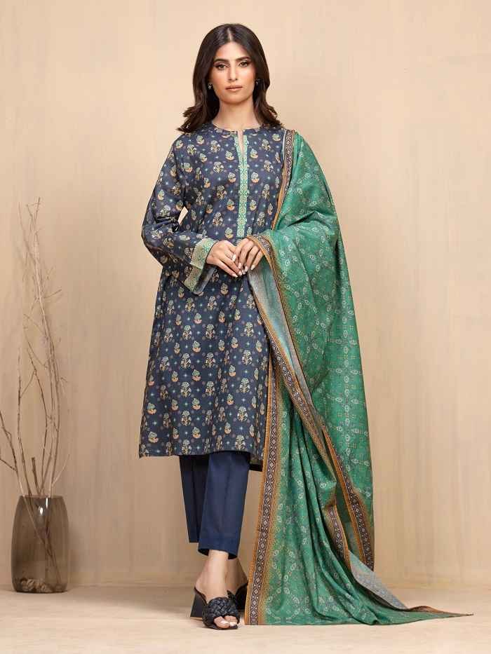 Winter blue khaddar printed 3-piece suit Rs:3,500 Rs:2,500.