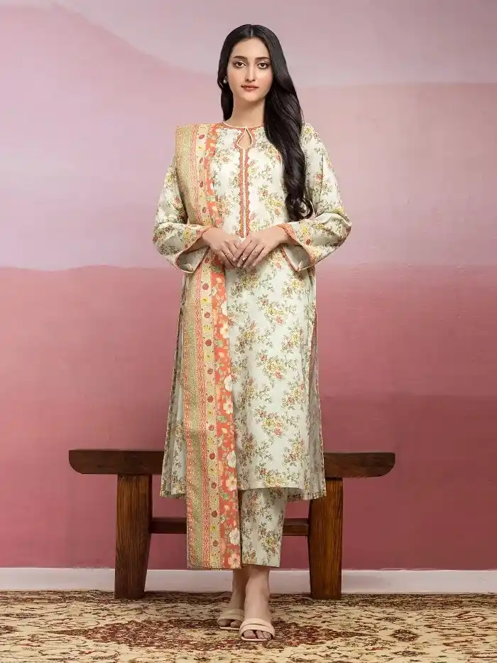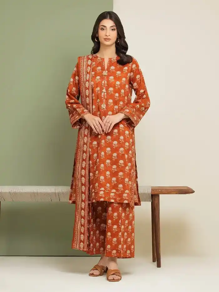 Orange color 3pc printed lawn suit Rs:3,300 Rs:3,000.