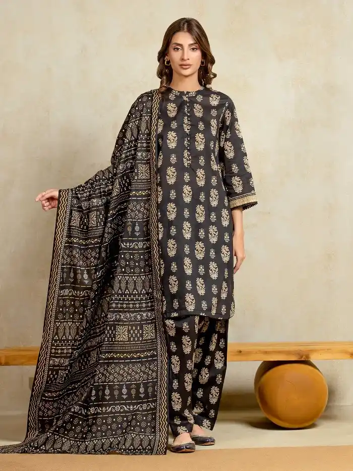 Black multi-printed khaddar 2piece unstitched suit PKR:2,790 PKR:2,232 only.