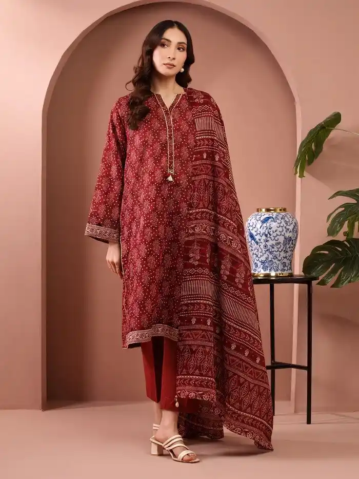 Maroon lawn 3piece unstitched suit for women Rs:3,500.