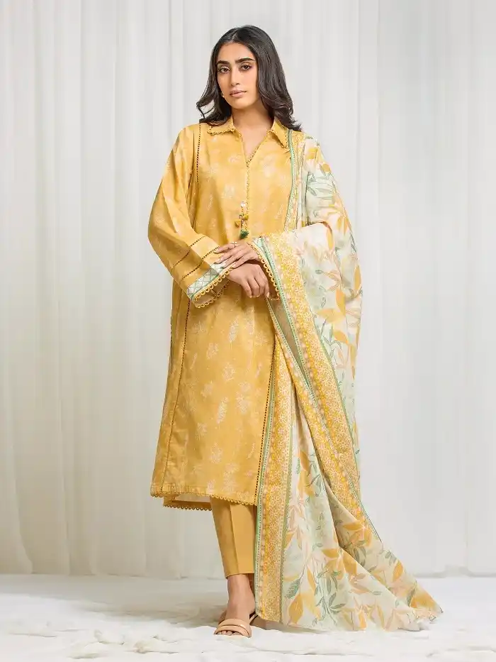 Unstitched light gold printed lawn 3 piece suit PKR:3,300 PKR:2,500