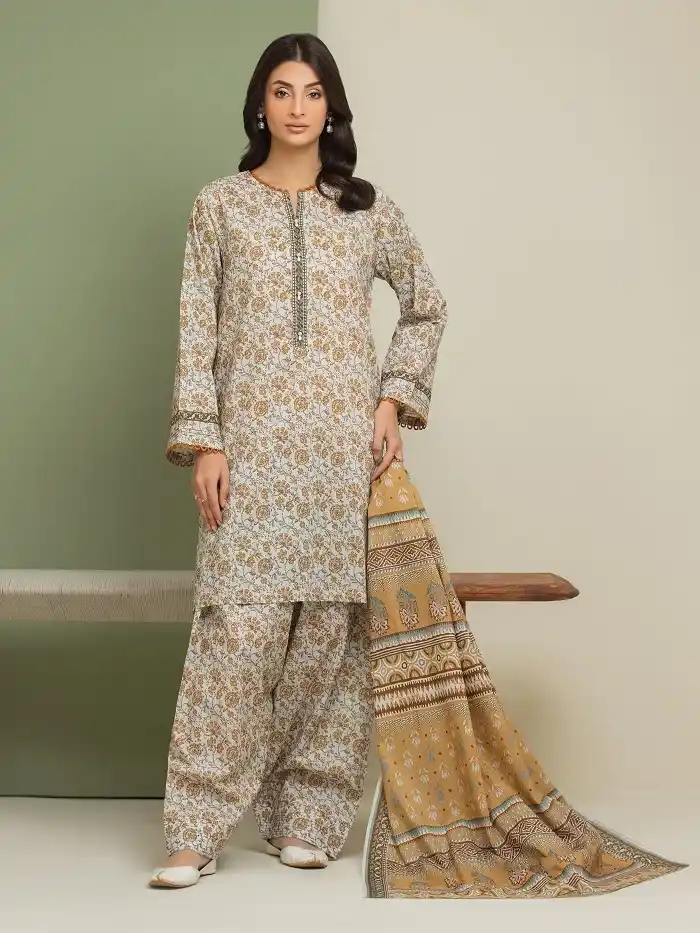 Unstitched fawn printed lawn 3-piece suit Rs:3,300 Rs:2,500.