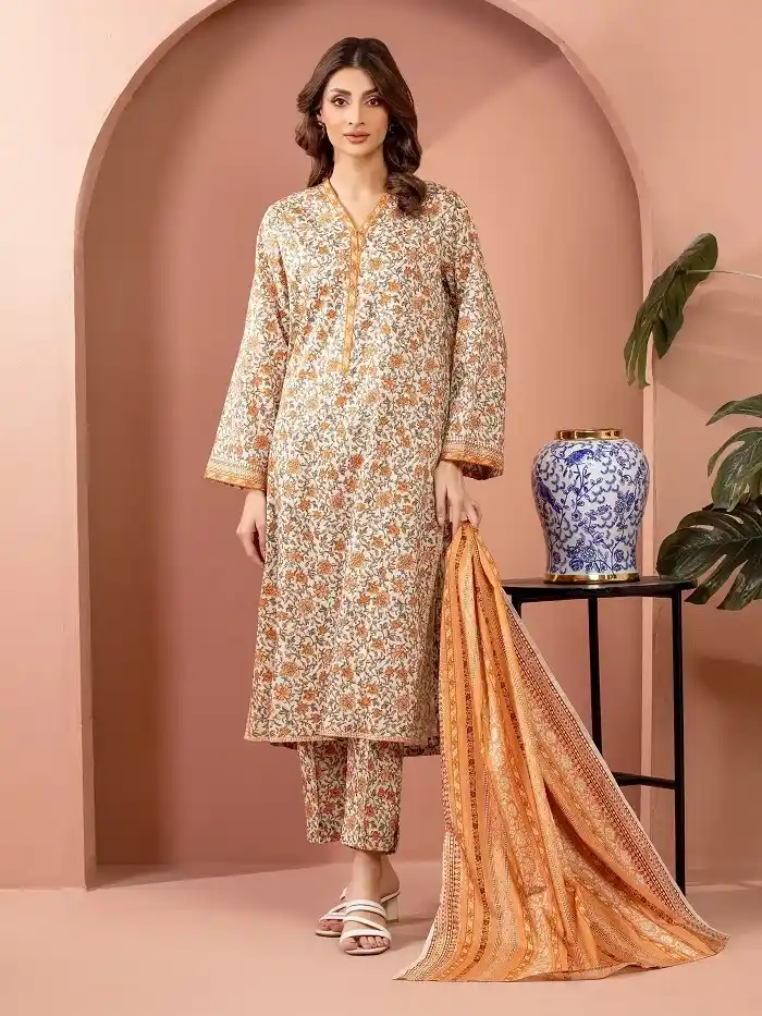 Stylish unstitched peach printed lawn 3 piece unstitched suit Rs:5,001 Rs:3,300 only.