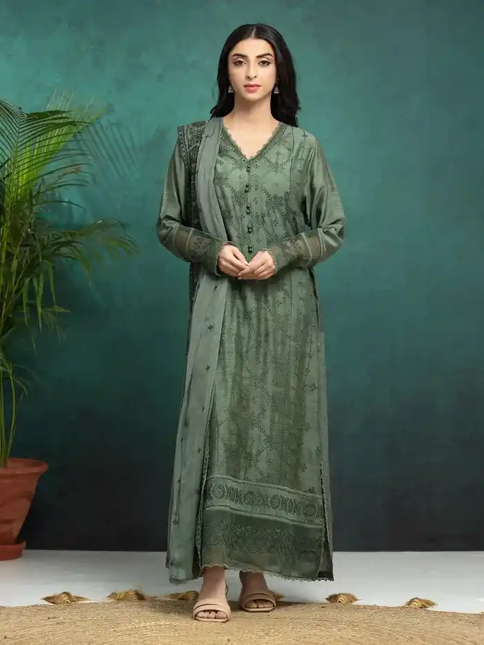 Green color summer 3 piece embroidered raw silk suit Rs:12,990 Rs:3,897.