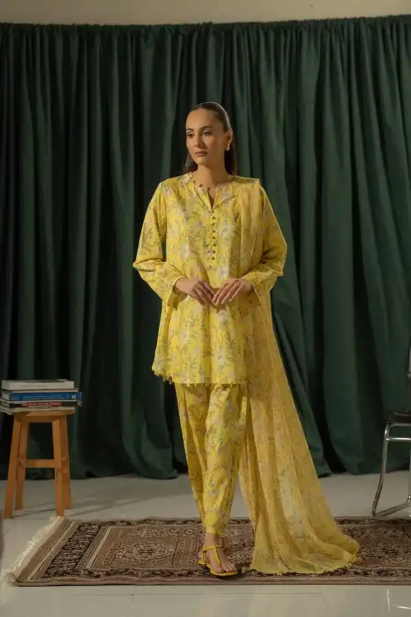 Yellow color lawn kurta, pant with printed dupatta available for Rupees:4,350.