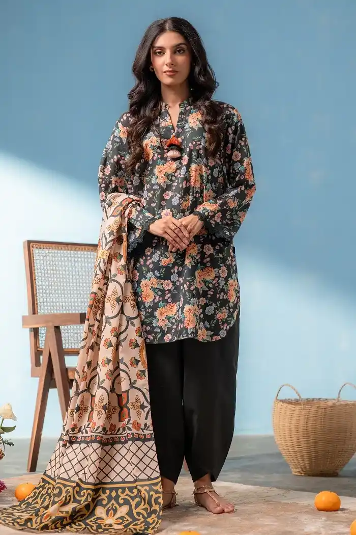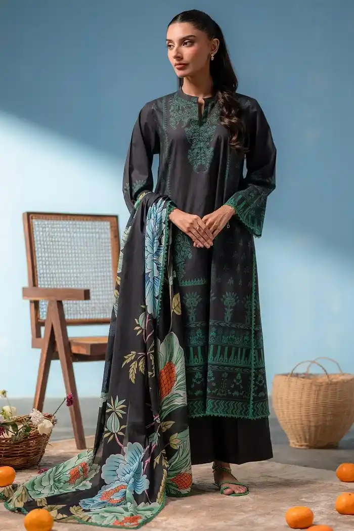 Black floral printed & embroidered 3 piece lawn suit Rs:4,690 Rs:3,986 only.