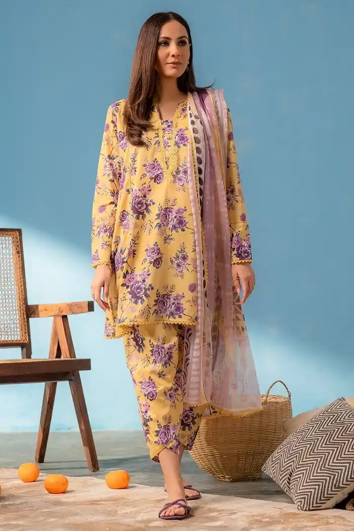 Yellow color lawn floral printed 3-piece suit Rs:4,690 Rs:3,986 only.