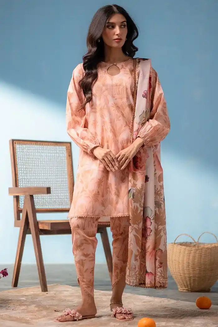 Stylish peach color digital printed 3 pc embroidered suit Rs:4,690 Rs:3,986 only.
