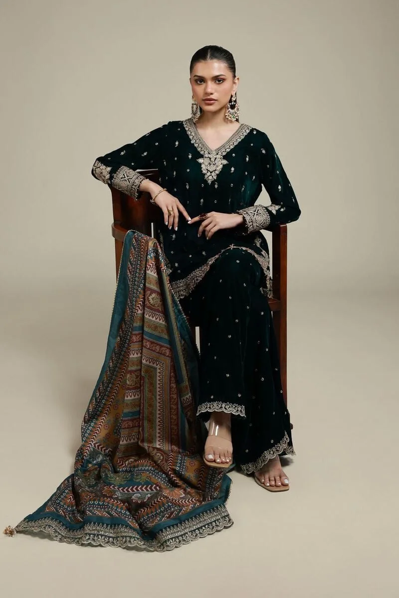 Embroidered velvet 3 piece luxury suit Rs:30,000.