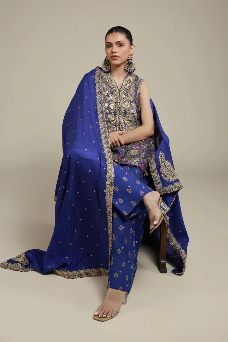 Luxury blue color 3 piece viscose raw silk unstitched festive wear suit Rs:25,000.