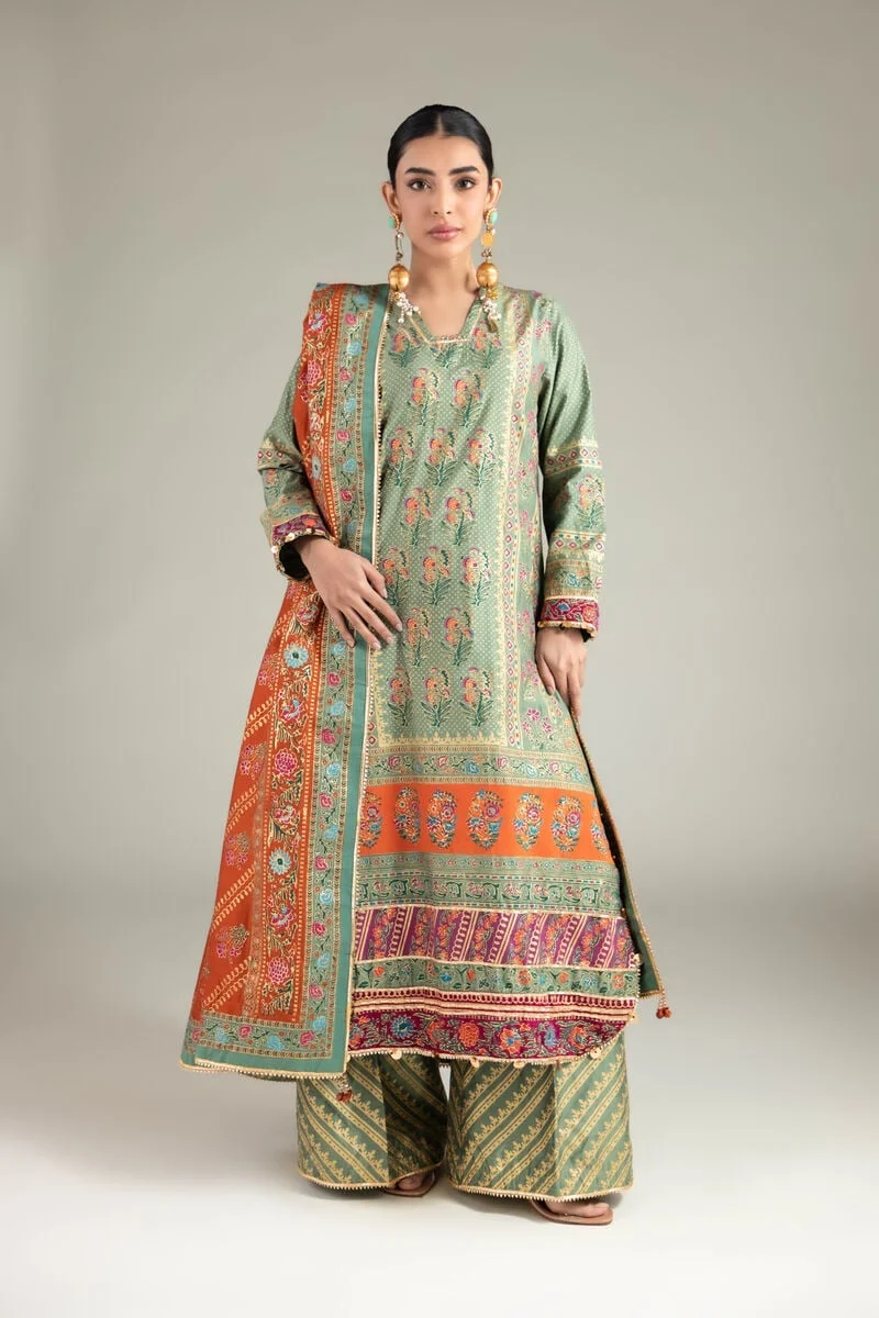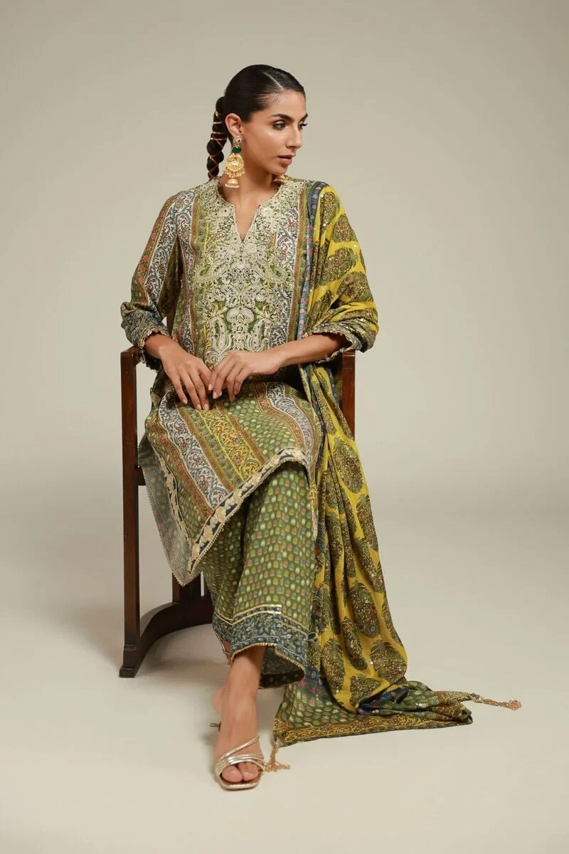 Stylish green color printed raw silk 3piece unstitched suit Rs:25,000.