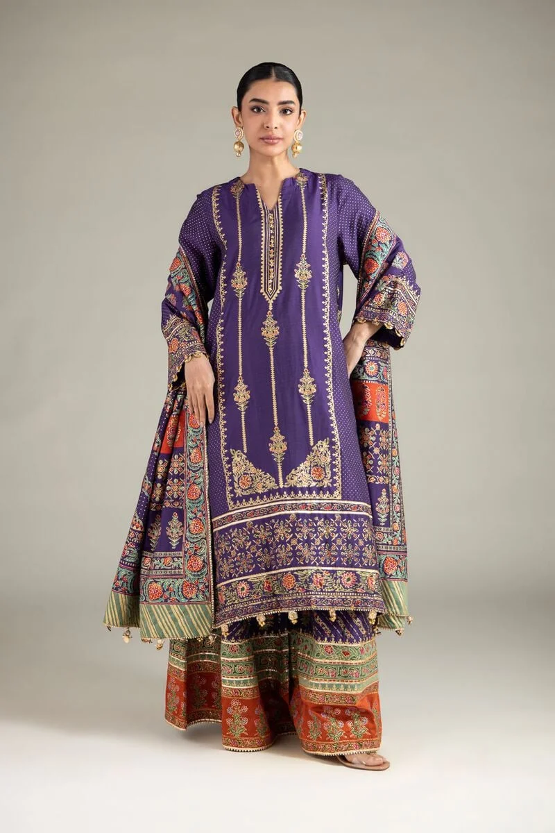 3piece co-ord set purple color embroidered unstitched Rs:25,000.