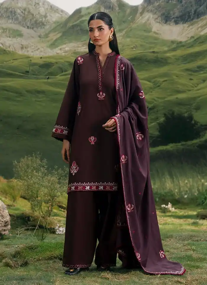 Khaddar 3 piece embroidered dark brown color suit with matching shawl Rs: 14,990.