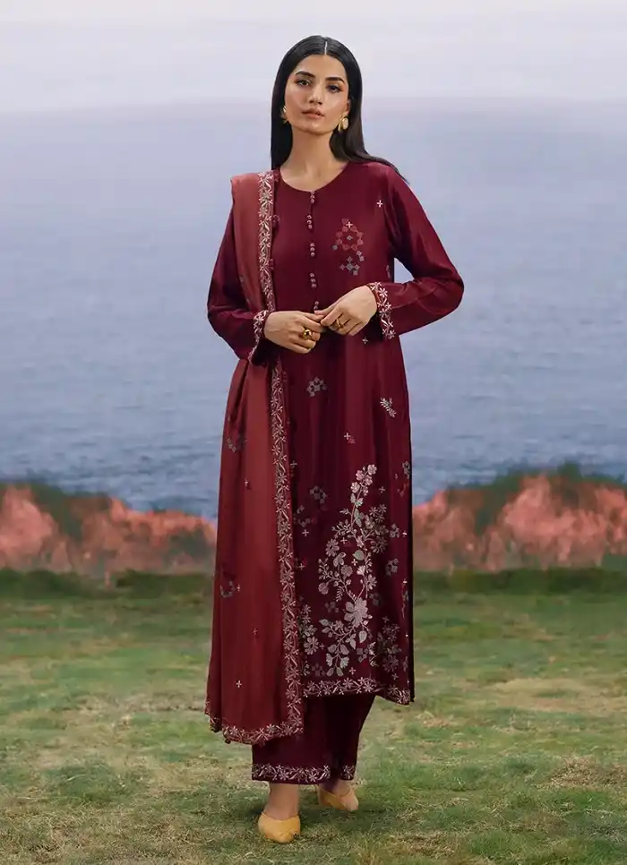 Stylish maroon color 3-piece floral embroidered suit with shawl PKR:9,990 PKR:6,992 only.
