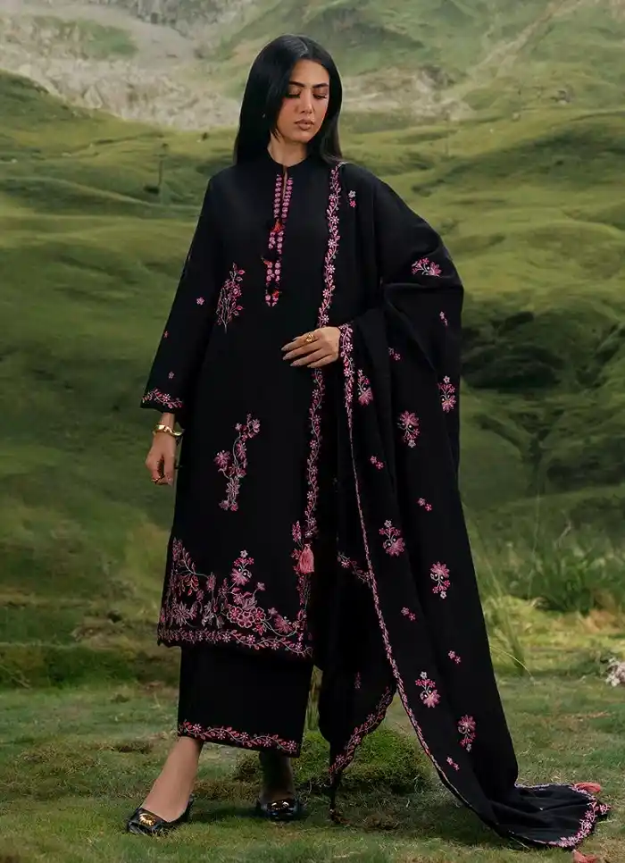 Black winter embroidered khaddar 3 pc suit Rs: 15,990.