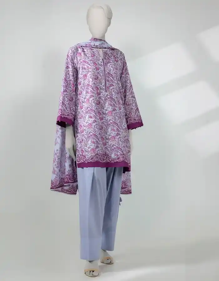3-piece purple-color unstitched digital printed lawn suit for women Rs:3,490 Rs:2,792 only.