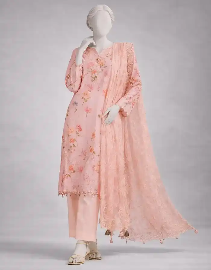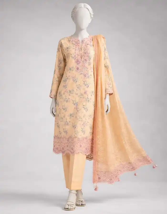 Beige pink lawn stitched 3pc suit for women Rs:9,490 only.